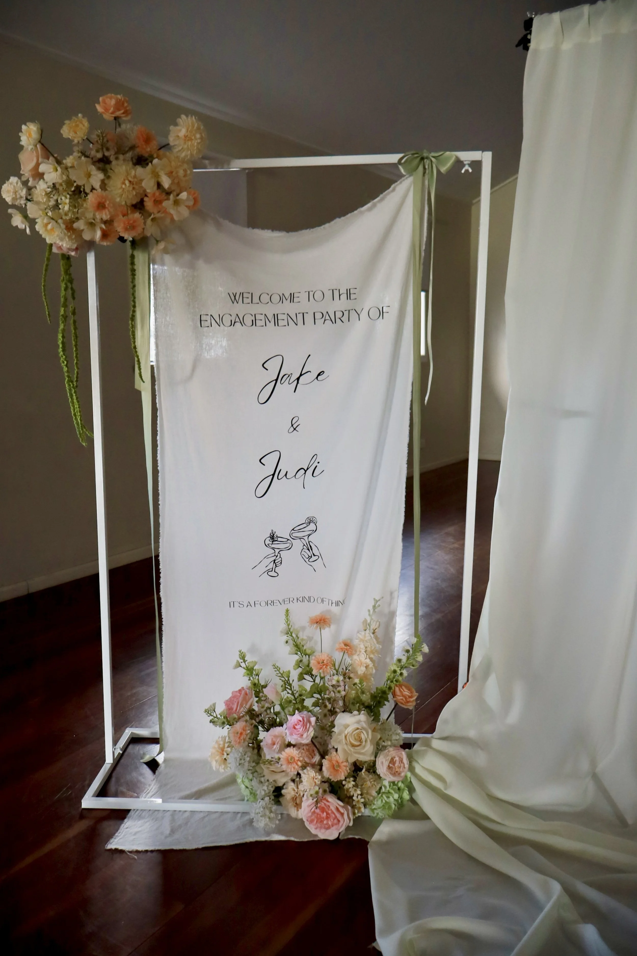 Custom linen or acrylic signage on white/black metal frame